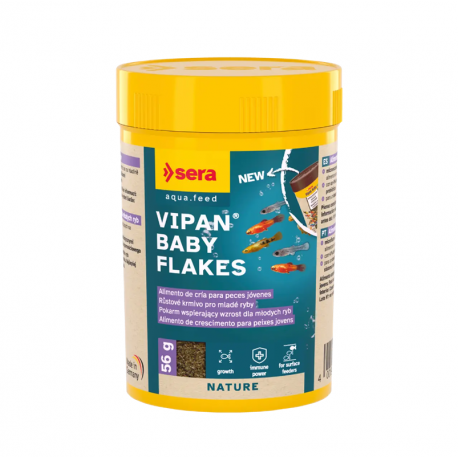Sera Vipan Baby Flakes es un alimento de cría en microcopos flotantes, altamente digestible y rico en proteínas naturales, ideal para garantizar un crecimiento saludable y vigoroso en peces jóvenes ornamentales.