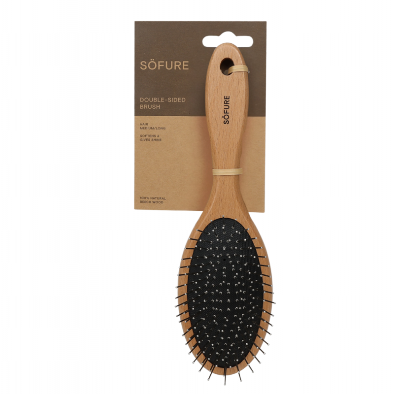 El cepillo doble Söfure Small Flexible Brush reúne dos caras para el cuidado del pelaje de tu perro o gato: un lado con cerdas de acero fino que ayudan a eliminar pelos sueltos y desenredar, y otro con cerdas naturales que potencian el brillo y dejan un acabado uniforme. Su mango ergonómico de madera de haya ofrece control y comodidad, ideal para rutinas de cepillado rápidas y eficaces en pelaje medio y largo.
