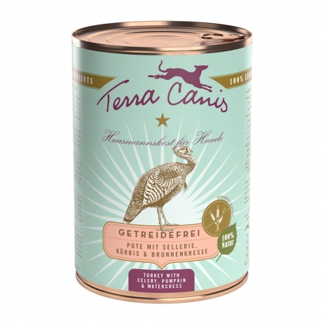Esta comida húmeda para perros forma parte de una gama grain free desarrollada como alimento completo para perros adultos de peso normal, independientemente de su raza. La receta se basa en pavo como fuente principal de proteína animal y prescinde de cereales, lo que la convierte en una opción adecuada para perros con sensibilidad a los cereales.