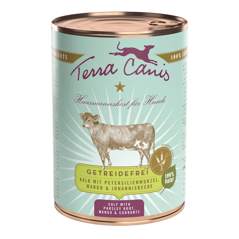 Comida húmeda para perros elaborada con ternera, raíz de perejil y mango, una receta sin cereales y de perfil natural, pensada para una alimentación diaria equilibrada y sabrosa.