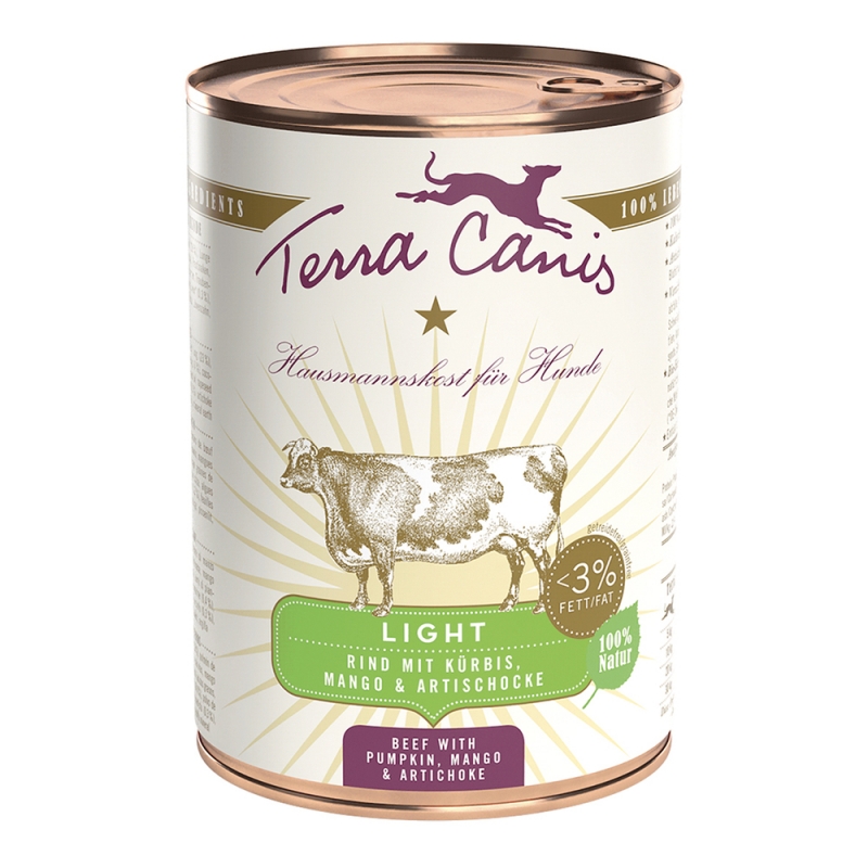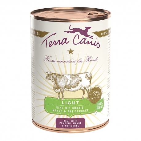 Comida húmeda para perros formulada para dietas light, elaborada con buey, calabaza y mango, ideal para perros que necesitan controlar el peso sin renunciar al sabor.