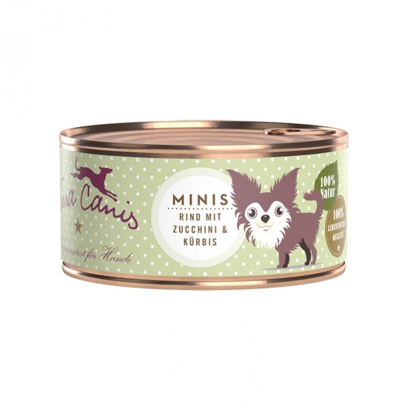 Comida húmeda para perros pequeños elaborada con buey, calabacín y calabaza, una receta sin cereales y de textura fina, ideal para perros mini y enanos.