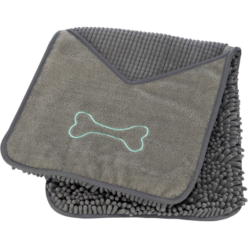 Toalla gris con manoplas integradas para perros y gatos. Hecha de microfibra (poliéster) con microfibras extralargas que absorben humedad y suciedad. Medidas: 78 × 32 cm. Secado rápido y muy absorbente.