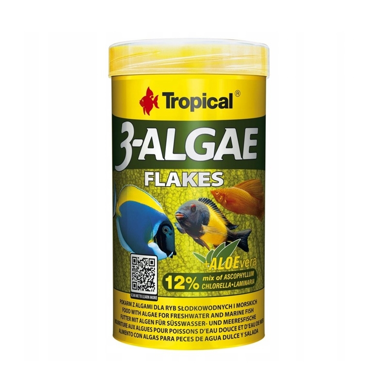 Tropical 3-Algae Flakes es un alimento en escamas formulado para la alimentación diaria de peces herbívoros de agua dulce y salada, para los que las algas son una parte esencial de su dieta. También puede utilizarse como alimento suplementario para peces omnívoros.