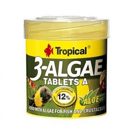 Tropical 3-Algae Tablets A es un alimento en forma de tabletas adhesivas especialmente formulado para la alimentación diaria de peces herbívoros, para quienes las algas son una parte fundamental de la dieta. También puede utilizarse como alimento suplementario en peces omnívoros y en crustáceos de agua dulce o salada.