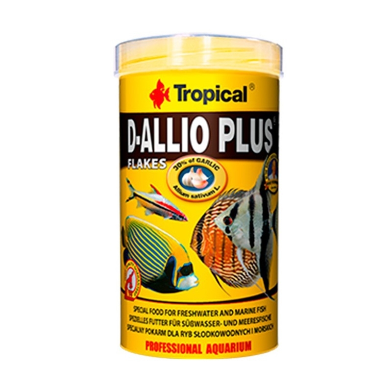 Tropical D-Allio Plus Flakes es un alimento multicomponente en forma de escamas, formulado para la alimentación diaria de discos y otras especies con altas necesidades nutricionales, incluyendo peces marinos. Su receta incorpora ajo (Allium sativum L.) en una proporción elevada (mín. 30%), lo que lo convierte en un alimento funcional y altamente valorado en acuariofilia.