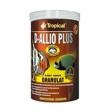 Tropical D-ALLIO PLUS GRANULAT es un alimento en gránulos con ajo (30%) para discos, peces exigentes y peces marinos, diseñado para reforzar la inmunidad, mejorar la digestión y apoyar a los peces durante adaptaciones y tratamientos.