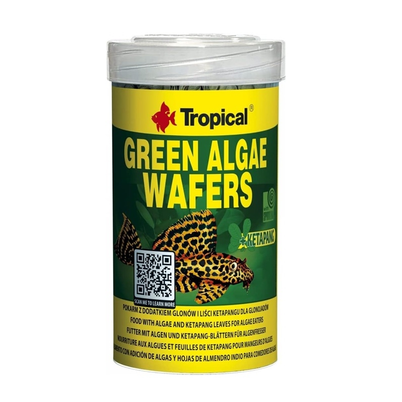 Tropical Green Algae Wafers es un alimento básico en forma de wafers, formulado para la alimentación diaria de peces cuya dieta requiere un alto aporte de componentes vegetales y algas. Está especialmente indicado para peces de la familia Loricariidae (plecos, Plecostomus) y otras especies de fondo, así como para crustáceos de agua dulce y de mar.