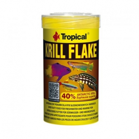 Tropical Krill Flakes es un alimento en copos de alta calidad, formulado para la alimentación diaria de peces omnívoros y carnívoros tanto de agua dulce como marina. Su receta destaca por un alto contenido de krill antártico (40%), un ingrediente natural muy apreciado por los peces por su valor nutricional y su sabor intenso.