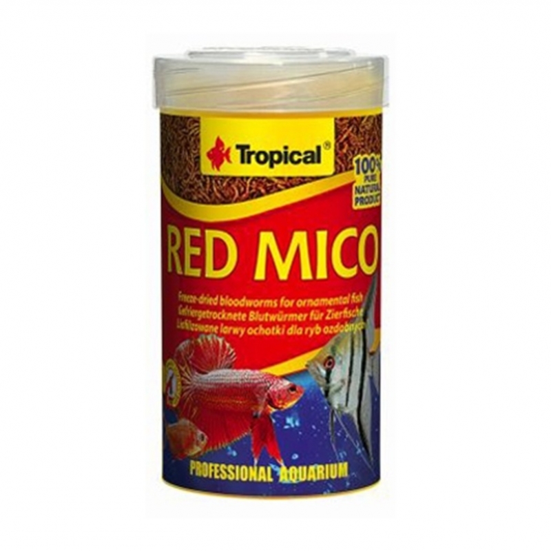 TROPICAL Red Mico es un snack natural 100 % liofilizado a base de gusanos de sangre, ideal para peces omnívoros y carnívoros, rico en proteínas altamente digestibles que estimulan el apetito y realzan la coloración.