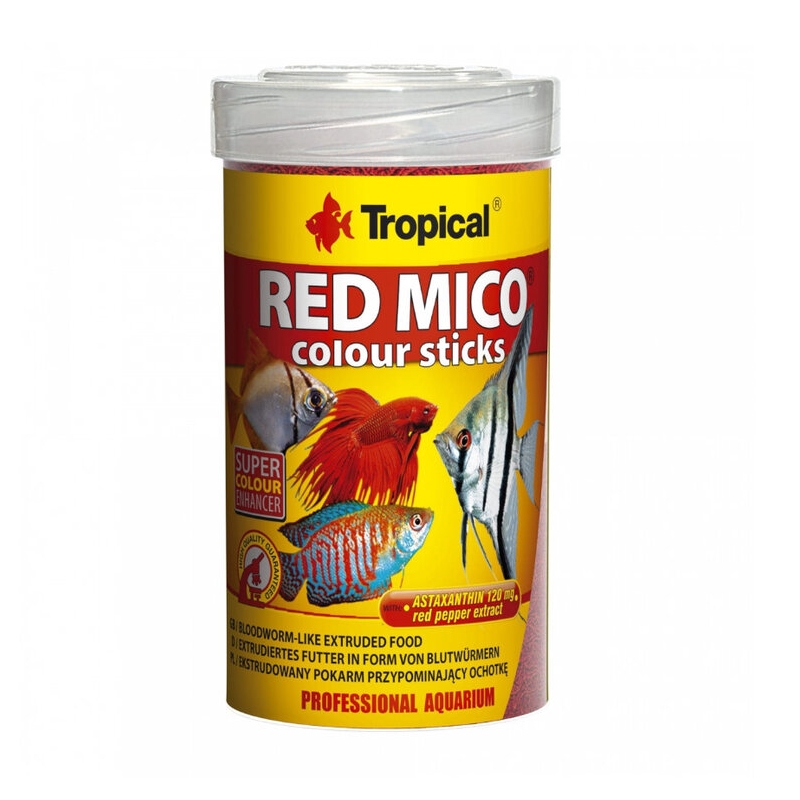 Tropical Red Mico Colour Stick es una comida en sticks flotantes para peces omnívoros y carnívoros de agua dulce, salobre o marina, con astaxantina y extracto de pimiento rojo para intensificar el color y apoyar la vitalidad.