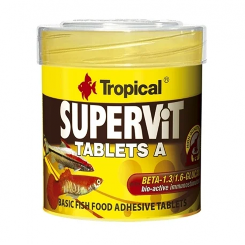 TROPICAL Supervit Tablets A es un alimento multicomponente en forma de comprimidos adhesivos, desarrollado para la alimentación diaria de peces de acuario (especialmente peces de fondo), juveniles en fase de transición, además de tortugas acuáticas y caracoles.