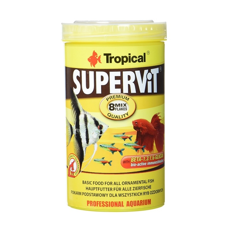 Tropical Supervit Chips es un alimento completo multiingrediente para peces de acuario, con beta-glucano y vitamina C para reforzar la inmunidad, además de componentes que apoyan la digestión y realzan el color.