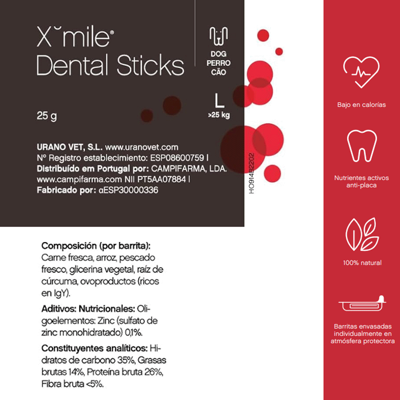 Administrar una barrita dental Xmile Plus S al día para mantener la higiene bucal de perros pequeños. Para una protección completa, combinar con el Gel Dentífrico Xmile Plus una o dos veces por semana.