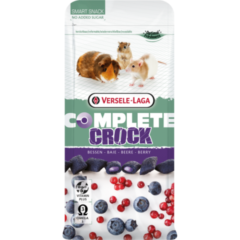 Versele Laga Complete Crock Snack de Bayas es un snack natural para pequeños mamíferos, recomendado para ratas, ratones, cobayas y conejos, con bayas crujientes, nutrición complementaria y apoyo antioxidante.