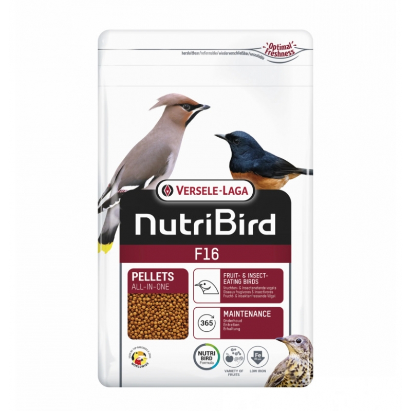 NutriBird F16 es un alimento extruido completo y equilibrado diseñado para aves insectívoras y frugívoras, como canarios, zorzales, arrendajos y loris. Su composición científicamente probada incluye cereales seleccionados y un mínimo del 10 % de fruta fresca, proporcionando una nutrición óptima sin desperdicios, ya que el formato extruido es 100 % consumible. Además, contiene Florastimul, un componente prebiótico que favorece la flora intestinal y protege contra trastornos digestivos.