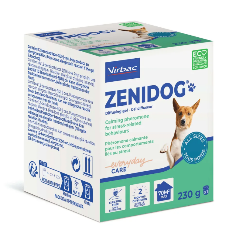 Virbac Zenidog Gel Difusor de feromonas calmantes para perros está formulado para ayudar a reducir los comportamientos asociados al estrés y favorecer un ambiente más tranquilo en el hogar. Contiene feromonas apaciguadoras caninas, que imitan las señales naturales que las perras emiten durante la lactancia para transmitir calma y seguridad a sus cachorros.