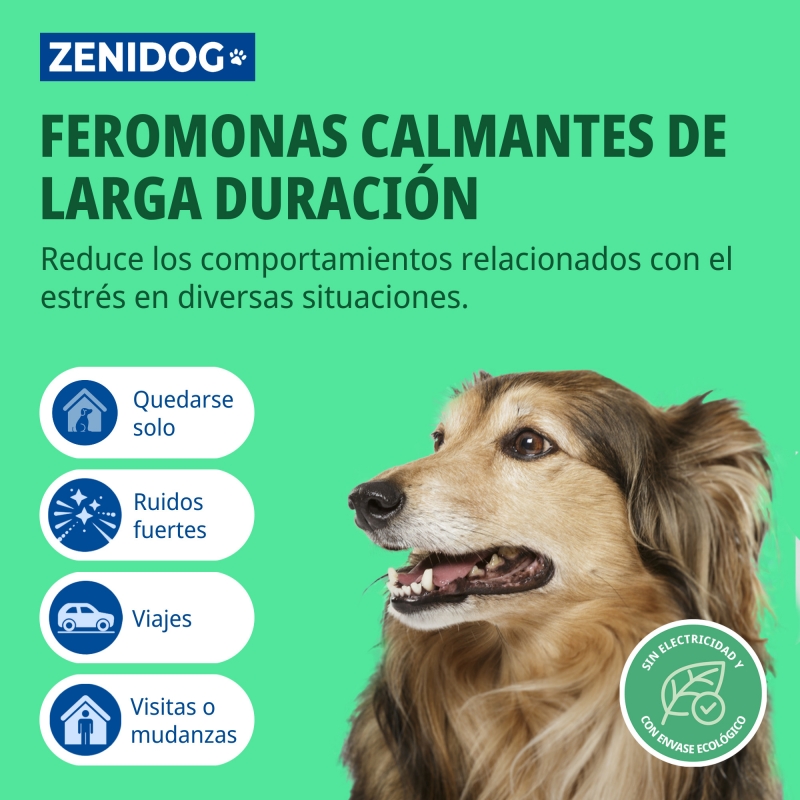 Este tranquilizante para perros en formato gel actúa de forma continua y discreta, sin necesidad de electricidad ni enchufes. El Zenidog Gel Difusor es ideal para perros de cualquier edad y tamaño, especialmente en situaciones de estrés prolongado como cambios en la rutina, ruidos ambientales, convivencia con otros animales o periodos de adaptación.