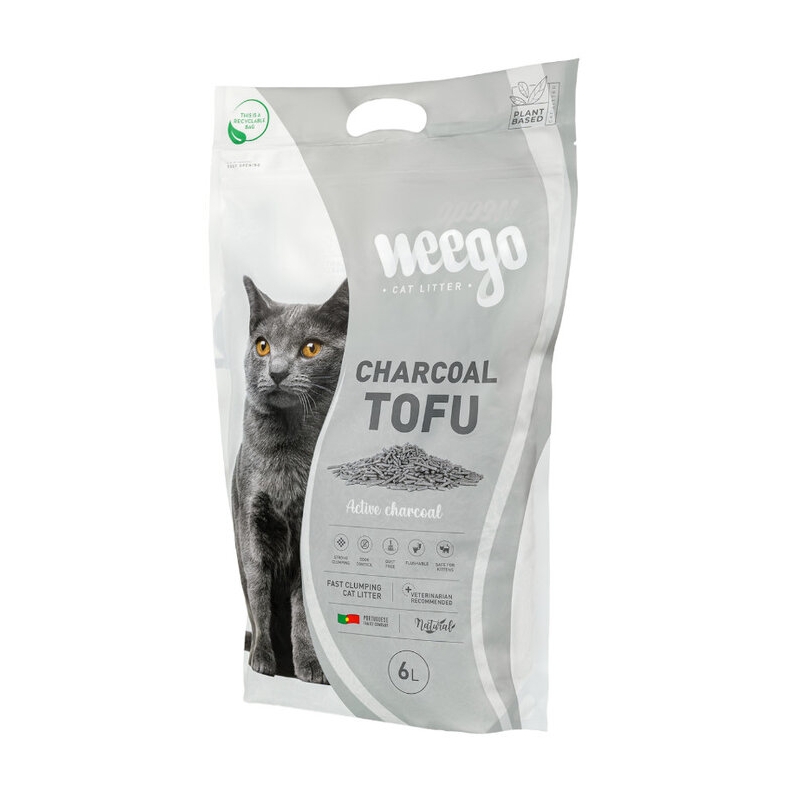 Weego Charcoal Tofu es una arena vegetal aglomerante elaborada con tofu biodegradable y carbón activo, diseñada para controlar los olores, producir casi cero polvo y ofrecer una textura suave y segura para las patas del gato.