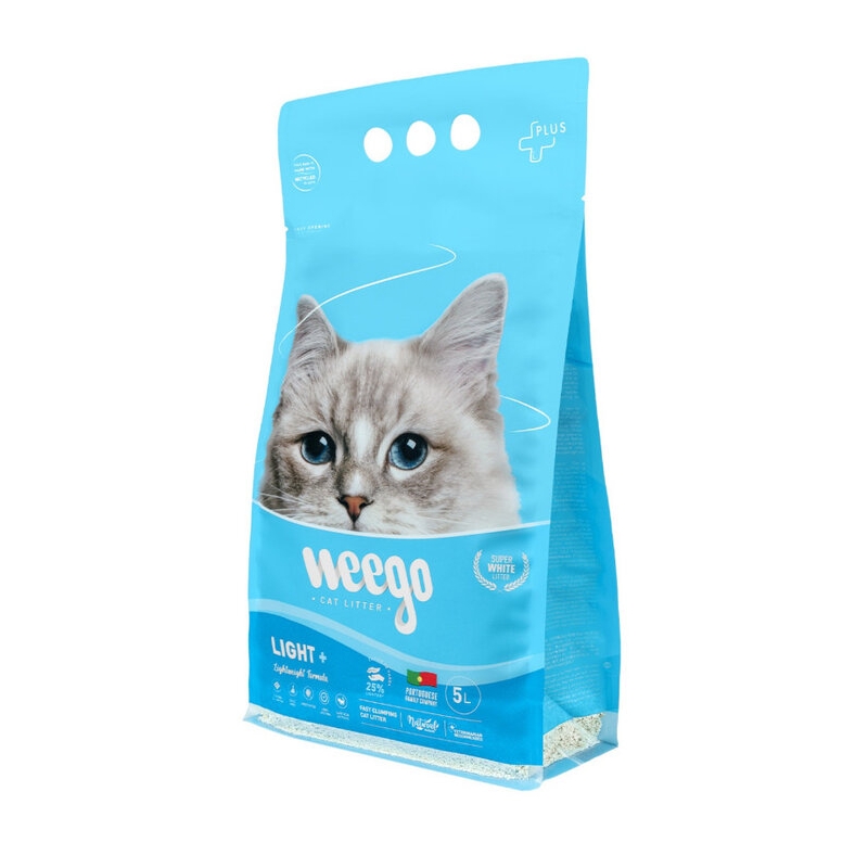 Weego Light+ es una arena aglomerante ligera de bentonita natural, libre de polvo y sin toxinas. Ofrece gran capacidad de absorción, control de olores y fácil manejo gracias a su menor peso.