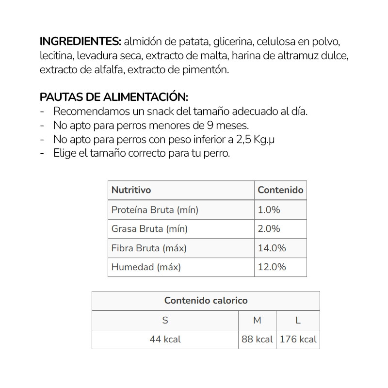 FÉCULA DE PATATA, GLICERINA, CELULOSA EN POLVO, LECITINA, LEVADURA SECA, EXTRACTO DE MALTA, HARINA DE ALTRAMUZ DULCE, EXTRACTO DE ALFALFA, EXTRACTO DE PIMENTÓN
