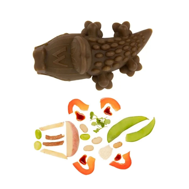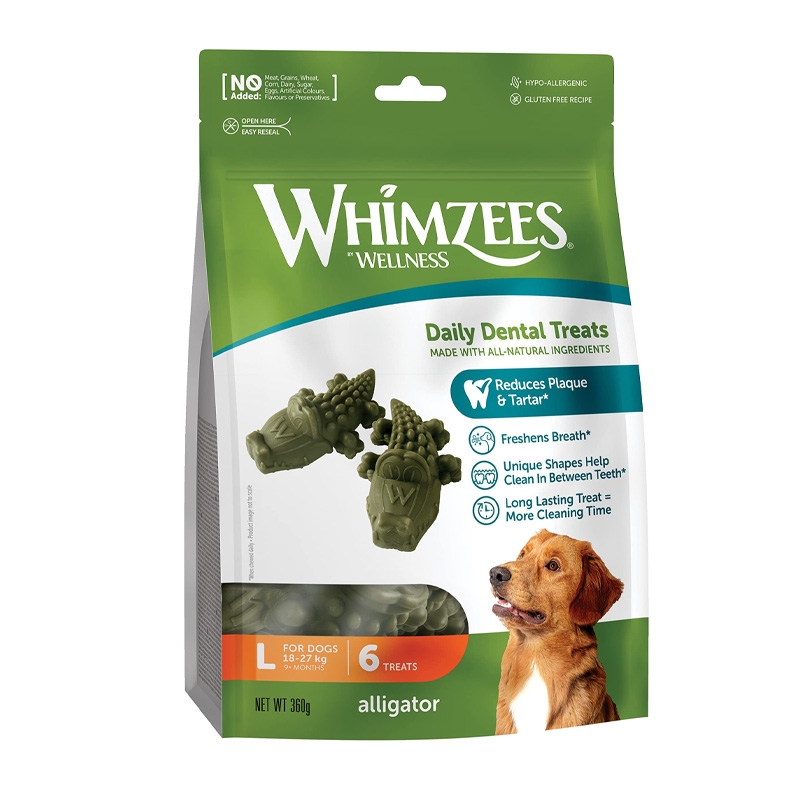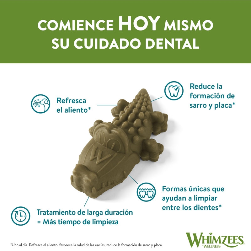 Consiente a tu perro grande con el irresistible Snack Dental Whimzees Alligator L. Estas delicias con forma de caimán son completamente naturales y están diseñadas para promover una salud bucal óptima. Con solo seis ingredientes principales, estos snacks no solo satisfacen su instinto de masticación, sino que también ayudan a eliminar la placa y el sarro mientras reducen las bacterias causantes del mal aliento.