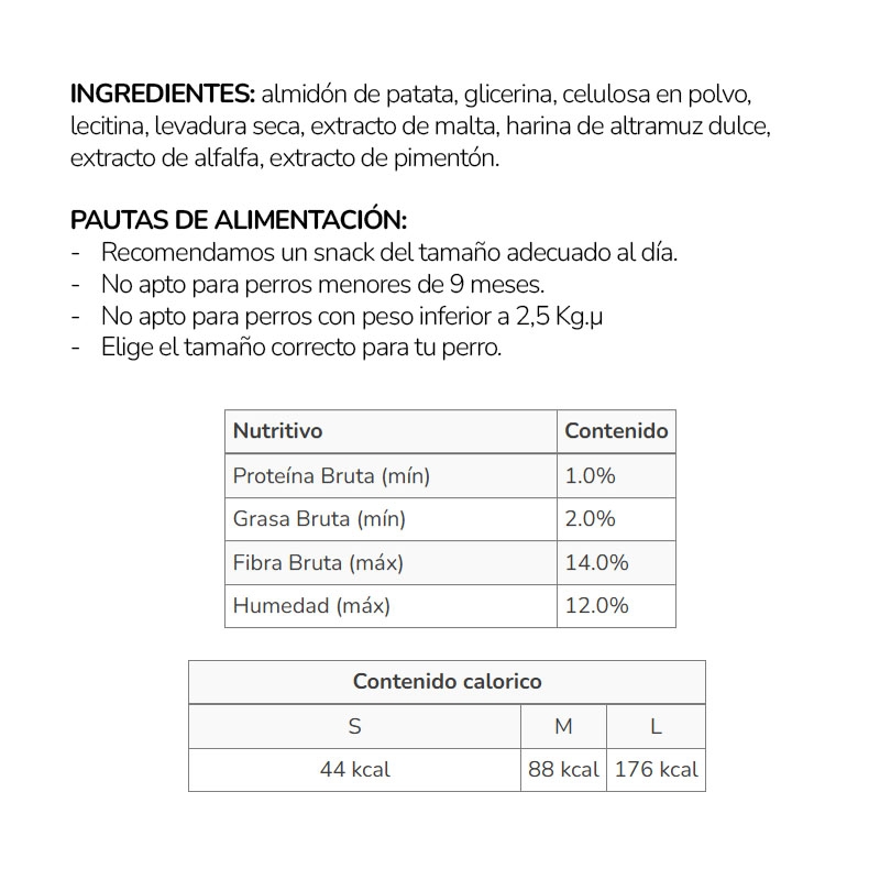 FÉCULA DE PATATA, GLICERINA, CELULOSA EN POLVO, LECITINA, LEVADURA SECA, EXTRACTO DE MALTA, HARINA DE ALTRAMUZ DULCE, EXTRACTO DE ALFALFA, EXTRACTO DE PIMENTÓN
