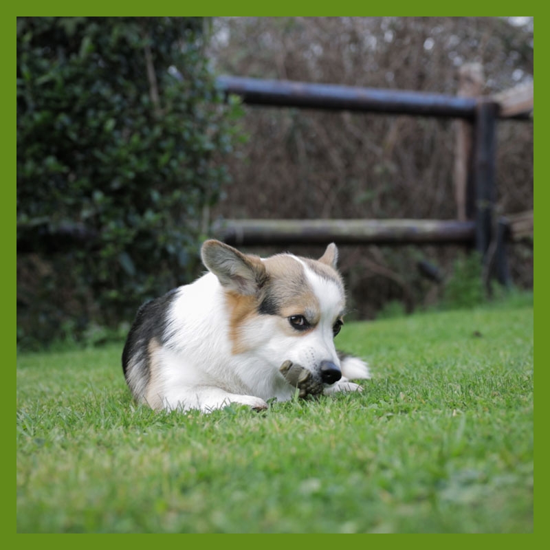 Snack dental comestible, vegetariano y sin cereales, perfecto para perros con sensibilidad alimentaria.
