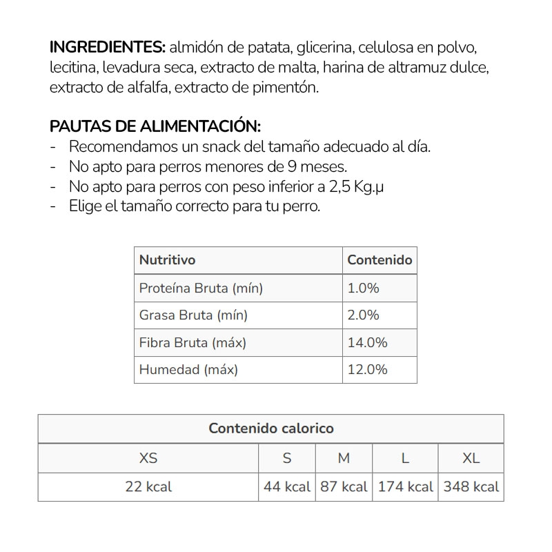 FÉCULA DE PATATA, GLICERINA, CELULOSA EN POLVO, LECITINA, LEVADURA SECA, EXTRACTO DE MALTA, HARINA DE ALTRAMUZ DULCE, EXTRACTO DE ALFALFA, EXTRACTO DE PIMENTÓN