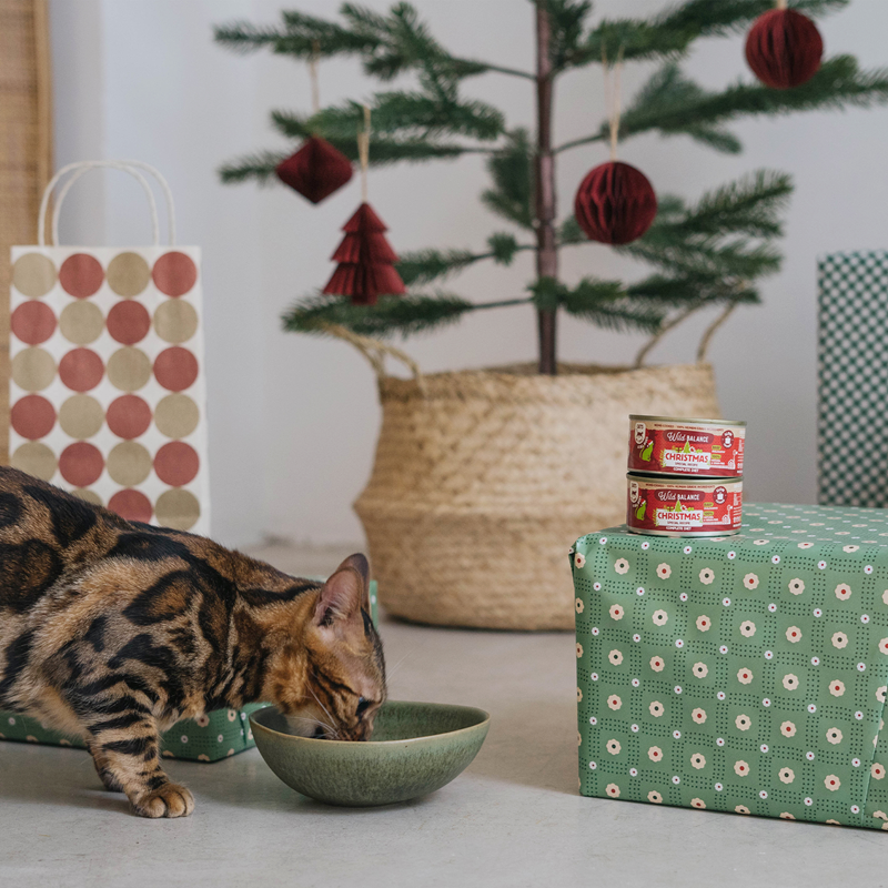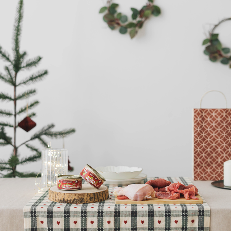 Comida húmeda natural con pavo y pescado para gatos. Receta alta en proteínas, sin cereales ni aditivos, que aporta Omega 3 y 6 para un pelaje brillante y una digestión equilibrada. Edición especial de Navidad.