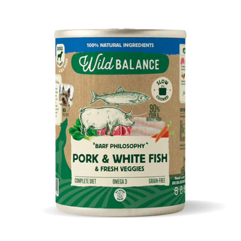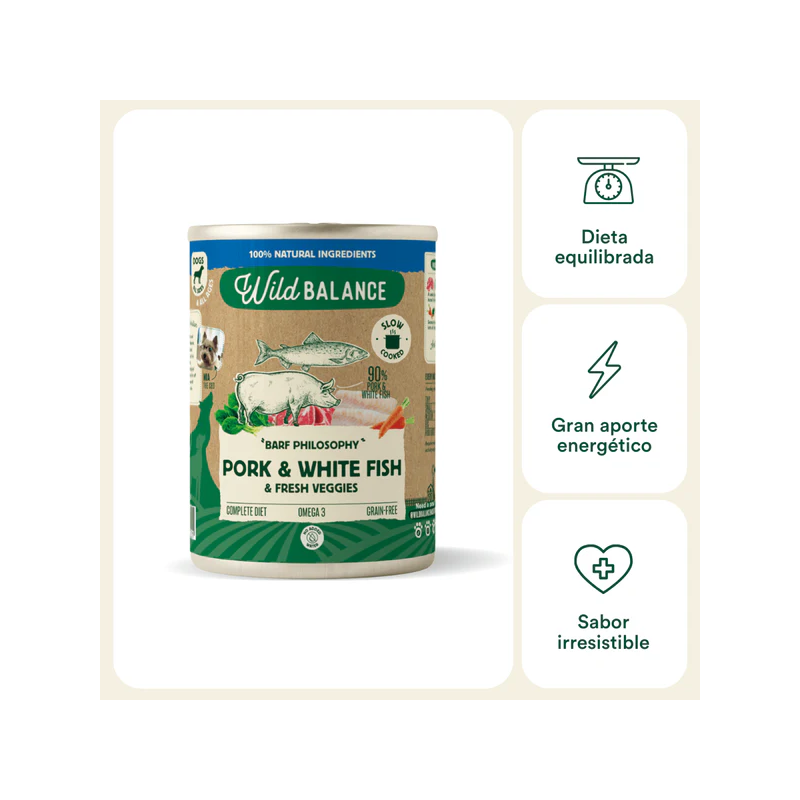 La comida húmeda natural para perros Wild Balance BARF con cerdo y merluza es una receta completa, nutritiva y altamente digestible, ideal para el día a día de tu peludo. Su combinación de carne y pescado aporta proteínas de calidad y un excelente equilibrio nutricional.