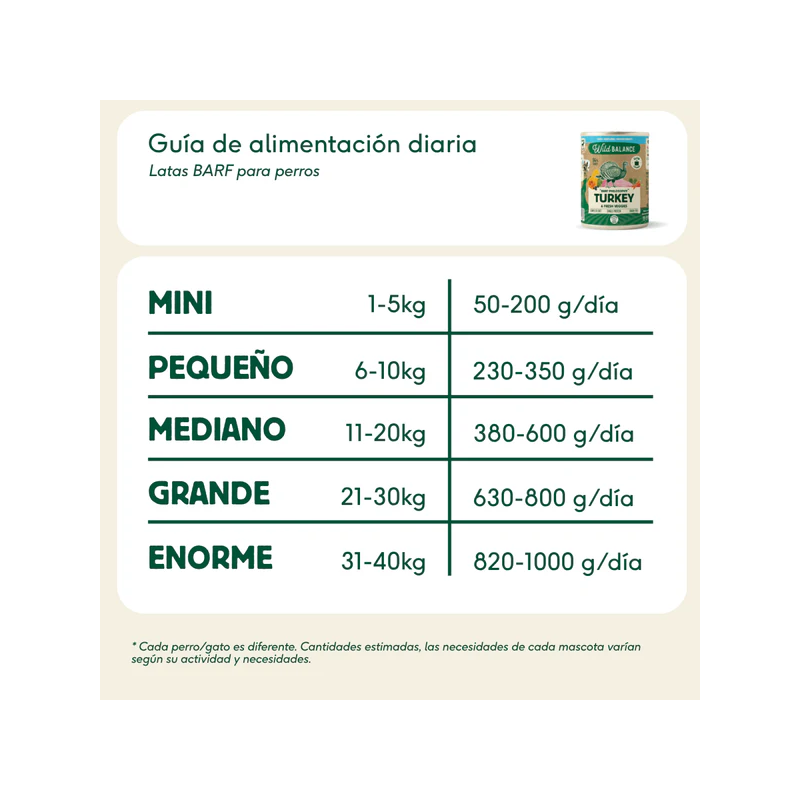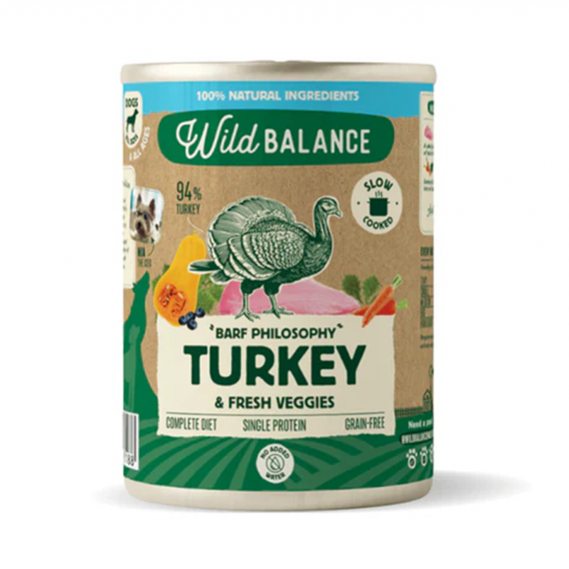 La comida húmeda natural para perros Wild Balance BARF con pavo es una receta equilibrada, nutritiva y altamente digestible, ideal para perros que necesitan controlar su peso sin renunciar a una alimentación completa.