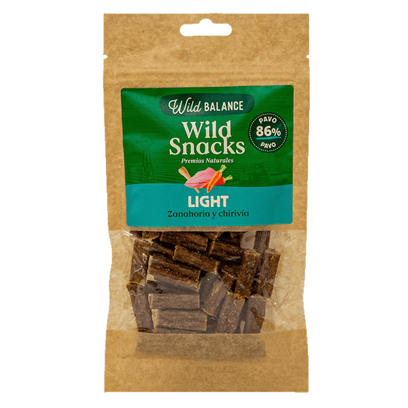 Wild Balance Light Snack con Pavo es un premio natural y saludable diseñado especialmente para perros con sobrepeso o que necesitan controlar su dieta sin renunciar al sabor. Elaborado con 86% de carne de pavo y vegetales deshidratados como la zanahoria y la chirivía, este snack aporta proteínas magras y fibra natural para favorecer una digestión ligera y mantener el peso ideal de tu peludo.