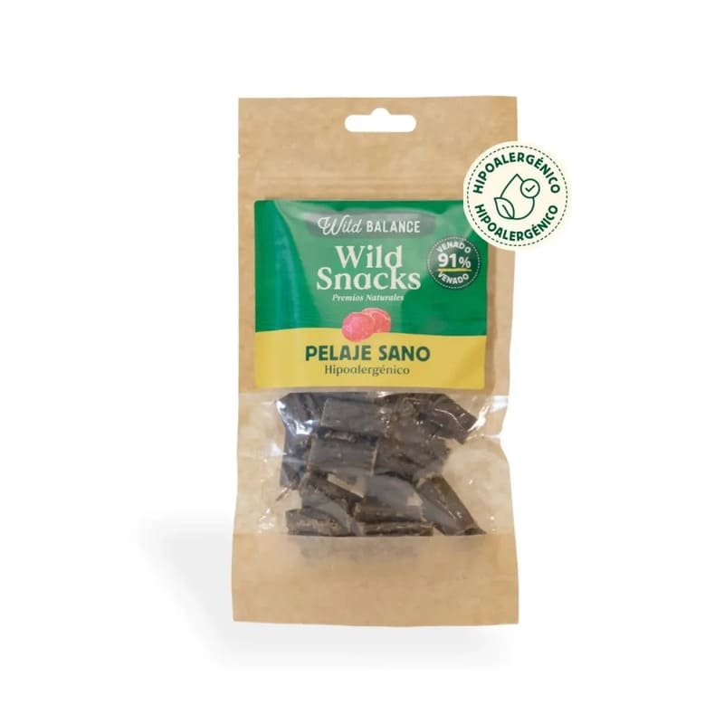 Wild Balance Wild Snacks Pelaje Sano de Venado es un snack hipoalergénico natural formulado con 91% de carne de venado, una proteína magra, digestible y de alta calidad ideal para perros con piel sensible o alergias alimentarias. Estos premios funcionales contribuyen a mejorar la salud de la piel y a mantener un pelaje brillante, fuerte y sedoso, actuando desde el interior para potenciar la belleza natural de tu peludo.