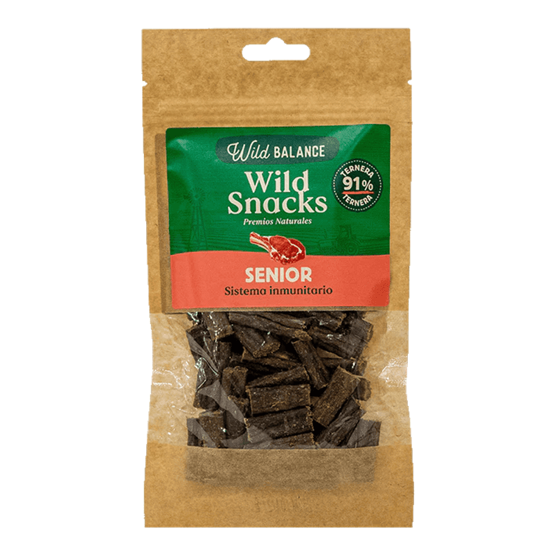 Wild Balance Senior Sistema Inmunitario es un snack natural para perros mayores formulado con 91% de carne de ternera, incluyendo un 24% de hígado de ternera, fuente natural de proteínas de alta calidad, hierro y vitaminas esenciales. Este premio funcional está diseñado para apoyar el sistema inmunológico de los perros senior, manteniendo su vitalidad, fuerza y bienestar general.