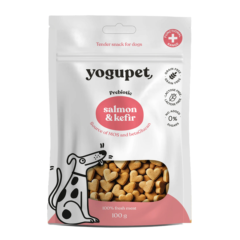 Un snack semihúmedo para perros con salmón y kéfir, ideal para perros de todas las edades que necesitan un premio tierno, digestivo y sabroso que complemente su alimentación diaria.