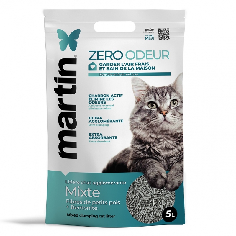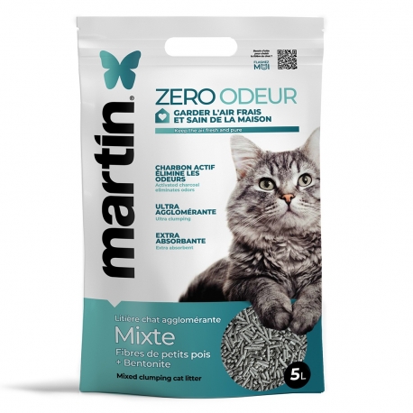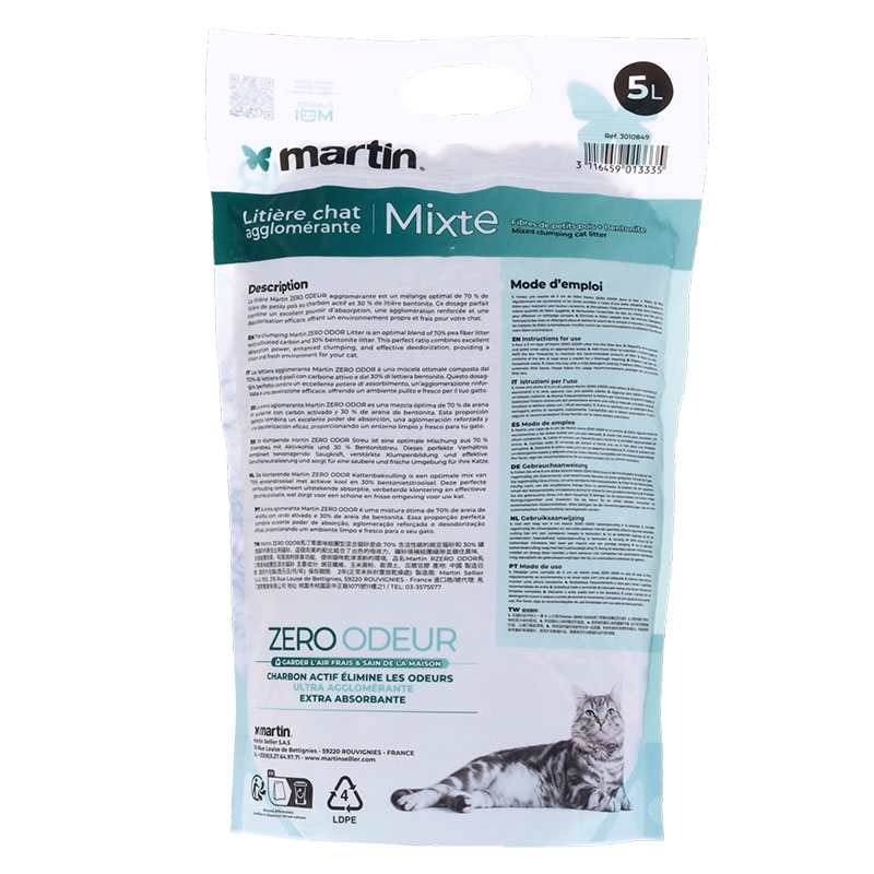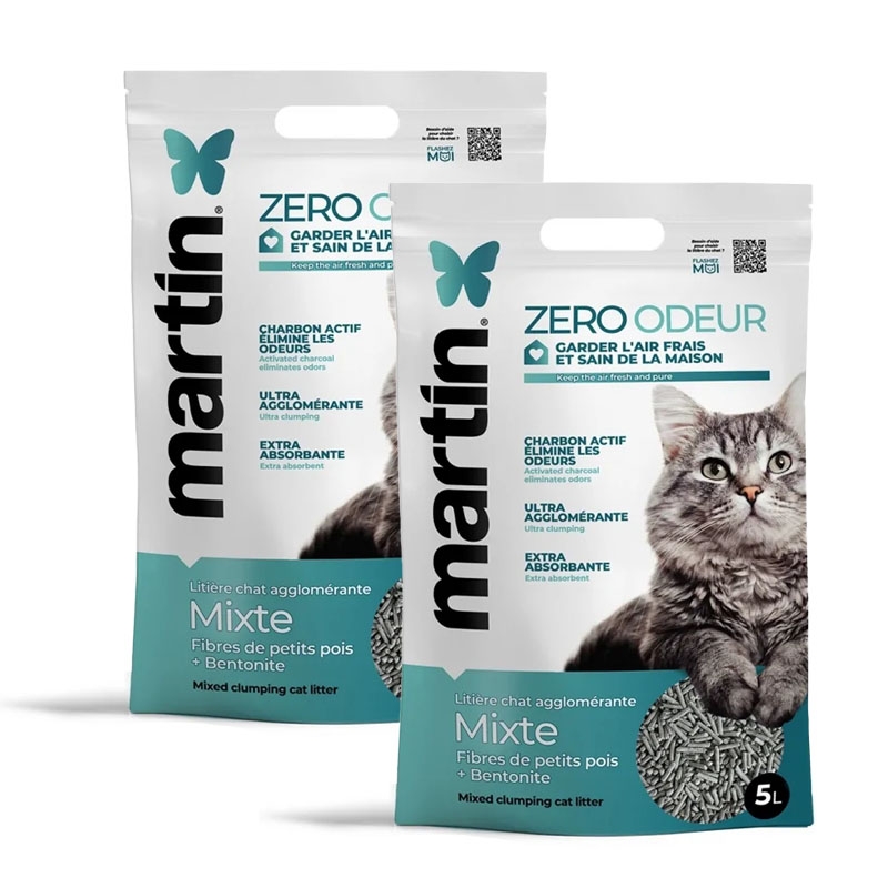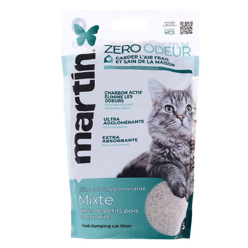 Arena mixta para gatos zero olor con guisante vegetal, carbón activo y bentonita, muy aglomerante, de alta absorción y compatible con areneros automáticos, ideal para mantener el arenero seco y sin olores.